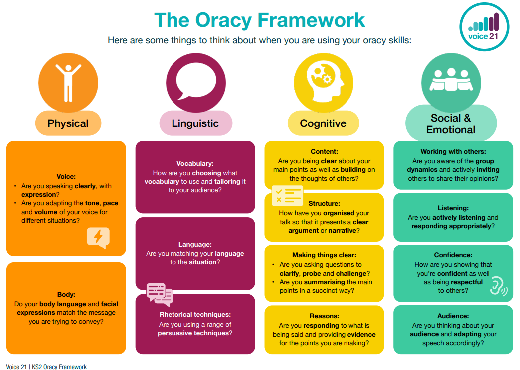 The Oracy framework is used to support our pupils to develop their speaking and listening through four key strands: physical, linguistic, cognitive, and social & emotional. By building these skills across the curriculum, pupils gain confidence, communicate clearly, and thrive in learning and life.